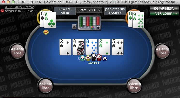 La mano tuvo su “miga”. En un bote 3-way, la acción se precipitó en el turn, cuando tanto Pablo como el otro rival restado habían conectado color de picas en el flop, mientras que el tercero, solo tenía un proyecto a las nuts que se acabaría completando en quinta.